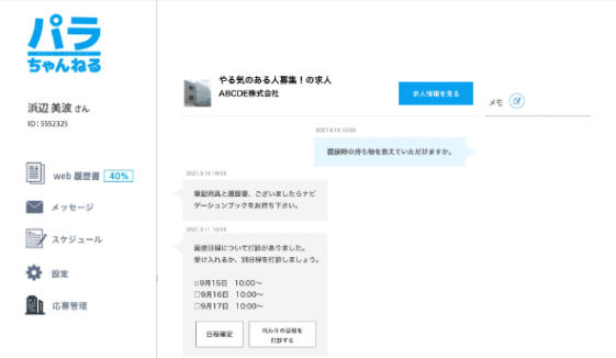パラちゃんねるでは、「エントリー時点の志望動機は不要」「10日以内に企業から回答がない場合は自動的に不合格としてステータスから削除される仕組み」など、就職・転職活動にかかる負担を軽減し、前向きに活動ができる仕組みを提供します。