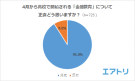 高校で開始される金融教育について「賛成」と回答した人が圧倒的に多く91.0%いた一方で、「反対」回答は9.0%でした。