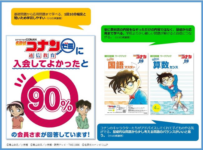 名探偵コナンゼミ通信教育が2021年に実施した会員アンケート調査では、「入会してよかった」と回答された方が90%(※1)、「基礎・基本が定着する」と回答された方が90%(※2)という結果で、教材の満足度が高く、小学校で押さえておきたい基礎・基本の学習に強い教材だという事が証明されています。