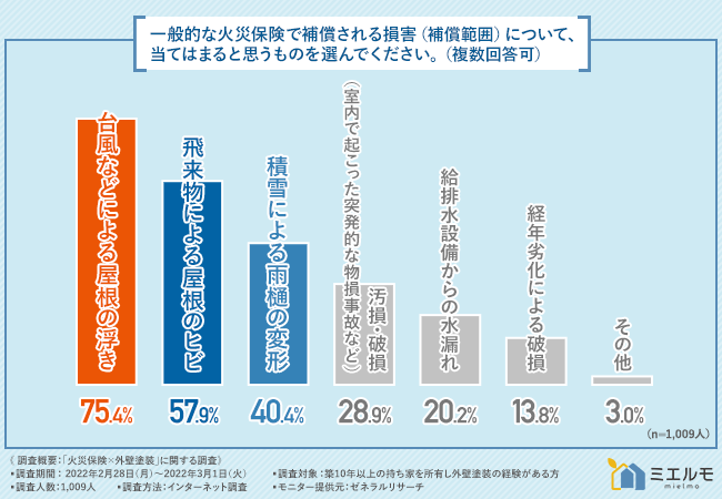 「一般的な火災保険で補償される損害(補償範囲)について、当てはまると思うものを選んでください(複数回答可)」と質問したところ、『台風などによる屋根の浮き(75.4%)』と回答した方が最も多く、次いで『飛来物による屋根のヒビ(57.9%)』『積雪による雨樋の変形(40.4%)』『汚損・破損(室内で起こった突発的な物損事故 など)(28.9%)』『給排水設備からの水漏れ(20.2%)』『経年劣化による破損(13.8%)』と続きました。