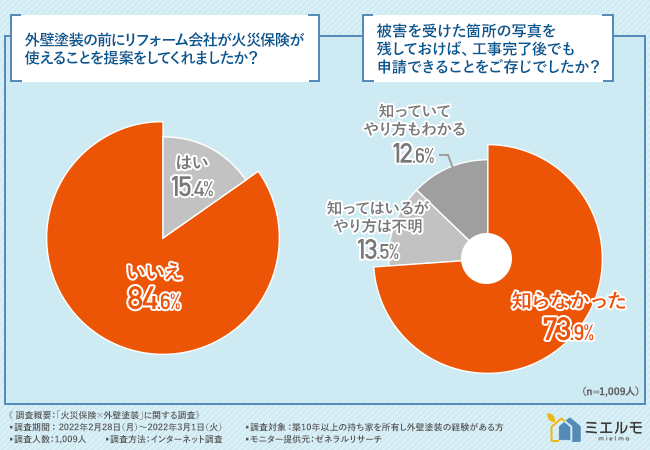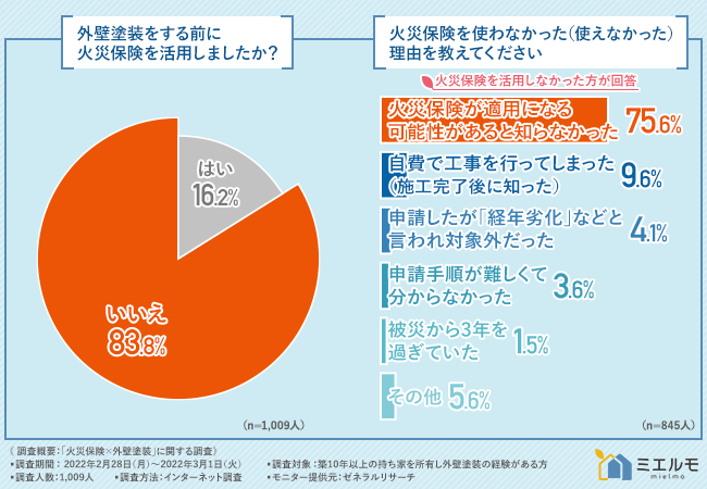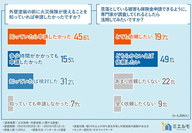 火災保険申請サポート会社の株式会社ミエルモ(本社:東京都目黒区)は、築10年以上の持ち家を所有し外壁塗装の経験がある方を対象に、「火災保険×外壁塗装」に関する調査を実施しました。