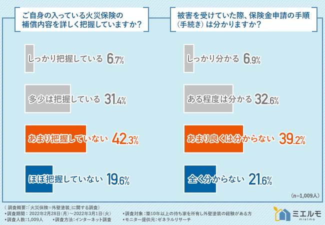 「ご自身の入っている火災保険の補償内容を詳しく把握していますか?」と質問したところ、『しっかり把握している(6.7%)』『多少は把握している(31.4%)』『あまり把握していない(42.3%)』『ほぼ把握していない(19.6%)』という結果となりました。