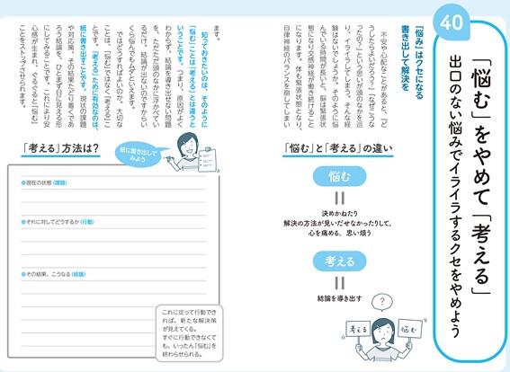 「考える」ために現状の課題や対応策、その結果たどり結論を、ひとまず目に見えるようにノートなどに書き出してください。これにより安心感が生まれ、ぐるぐると「悩む」ことをストップさせられます。