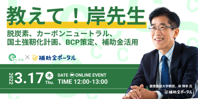 株式会社補助金ポータル(本社:東京都渋谷区、代表取締役:福井彰次 以下、補助金ポータル)はスペシャルゲストに「岸 博幸氏」を迎え、株式会社エコ・プラン(本社:東京都新宿区、代表取締役:三ツ廣 修 以下、エコ・プラン)と「SDGs、脱炭素、カーボンニュートラル、BCP策定、補助金活用」への取り組みの無料オンラインセミナーを開催します。Zoomでお気軽にご視聴いただけますので、ぜひご参加ください。