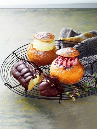 シャモニー プレミアム(贅沢生クリーム、ハスカップ/1個)各487円 パン&クリームの至福のコンビ(写真奥)