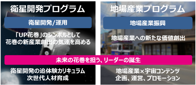 「UP花巻」は、2024年の人工衛星打上げを主軸に、衛星の開発から運用を実施する「衛星開発プログラム」と、宇宙を題材に花巻を支える地場産業に新たな価値を創出することを目的とした「地場産業プログラム」の2つの取り組みを通じて、花巻の魅力を全国・海外へ再発信し花巻を盛り上げていくことを目的としています。また、これらのプログラムでは花巻にゆかりのある若者にも参画してもらい、未来の花巻のリーダーの育成にも貢献していくことも視野に入れています。