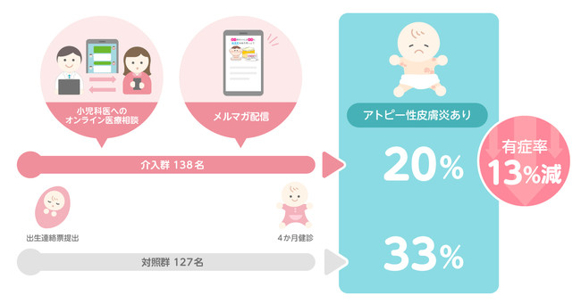 その結果、介入群は対照群と比べて、生後4か月時点のアトピー性皮膚炎の有症率が13%低くなりました。これは、オンライン医療相談で小児科医から直接受ける自宅でのスキンケア方法についてのアドバイス、またメールマガジンでスキンケアの重要性などの情報を得られる環境が、アトピー性皮膚炎を抑えることに有効であることを示唆しています。
