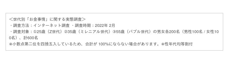 松井証券株式会社(本社:東京都千代田区、代表取締役社長:和里田 聰)は、全国の25歳(以下、Z世代)、35歳(以下、ミレニアル世代)、55歳(以下、バブル世代)の男女・合計600名を対象に、<世代別「お金事情」に関する実態調査>をインターネット調査にて実施しました。