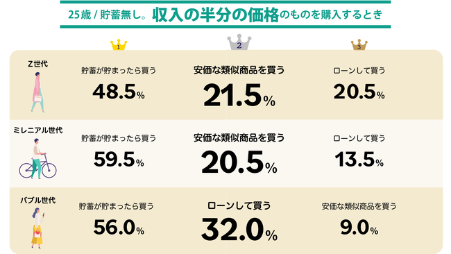 結果の内訳は、「貯蓄が貯まったら買う」という回答がZ世代(48.5%)、ミレニアル世代(59.5%)、バブル世代(56.0)となり、「貯蓄が溜まったら買う」に次ぐ回答は、Z世代とミレニアル世代では、「安価な類似商品を買う」(21.5%)、ミレニアル世代(20.5%)に対し、バブル世代は「ローンして買う(32.0%)」と回答。
