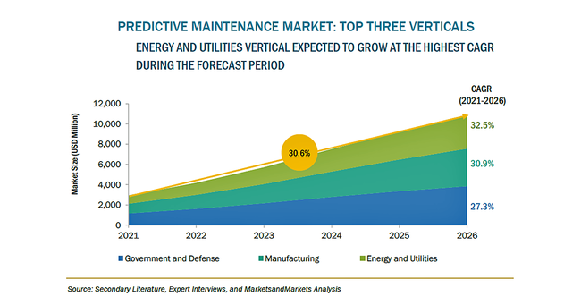 予知保全の市場規模は、2021年の42億米ドルからCAGR30.6%で成長し、2026年には159億米ドルに達すると予測されています。企業によるマーケティングや広告活動への支出の増加、市場を牽引するカスタマーインテリジェンスの変化、顧客チャネルの普及など、さまざまな要因が予知保全技術やサービスの採用を促進しています。