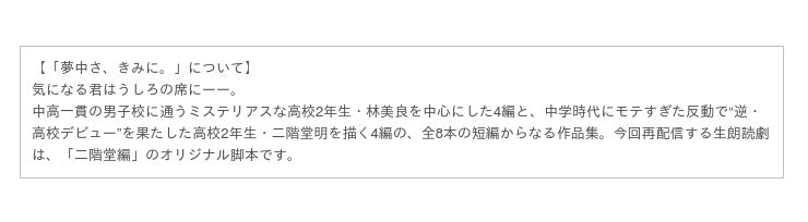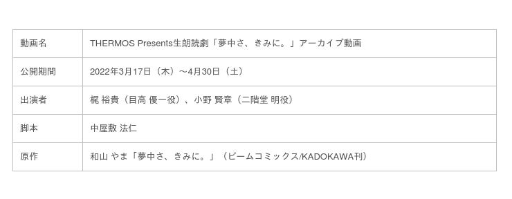 ◆初回動画THERMOS Presents生朗読劇「夢中さ、きみに。」アーカイブ動画期間限定再公開 概要