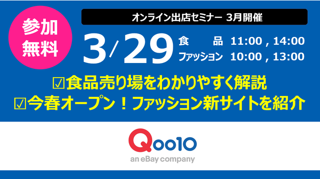 インターネット総合ショッピングモール「Qoo10(キューテン)」を運営するeBay Japan合同会社(本社:東京都港区、代表取締役:グ ジャヒョン)は、食品をテーマにした無料のオンライン出店セミナーを2022年3月29日(火)に開催します。また、2022年春にローンチ予定の新ファッションサイトのオンライン出店セミナーも、同日に開催いたします。