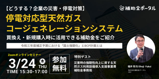 株式会社補助金ポータル(本社:東京都渋谷区、代表取締役:福井彰次 以下、補助金ポータル)は、地震などの災害時において発生する停電対策として注目をあつめている『停電対応型天然ガスコージェネレーションシステム』の買換えや新規導入時に活用できる「令和三年度補正予算」災害時の強靭性向上に資する天然ガス利用設備導入支援事業費補助金について紹介するオンラインセミナーを3月24日木曜日15時半より開催いたします。