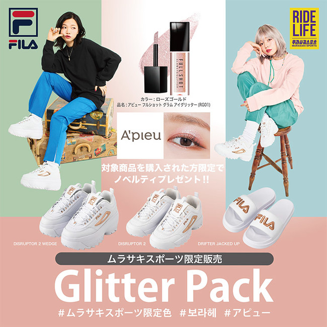 株式会社ミシャジャパン(本社:東京都港区)は、ときめく瞬間を楽しむための韓国コスメブランドA’pieu(アピュー)の日本未発売商品「アピュー フルショット グラム アイグリッター(RG01)」を、Z世代から高い支持を得るスポーツブランド「FILA」の新シューズコレクション“Glitter Pack”をご購入されたお客様へノベルティとしてプレゼントいたします。カラーは“Glitter Pack”をイメージした『ROSE GOLD』でムラサキスポーツ限定のオリジナルカラーです。
