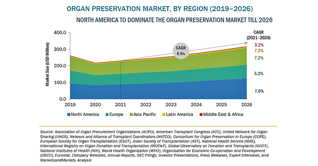 臓器保存の市場規模は、2021年の2億3,000万米ドルからCAGR6.6%で成長し、2026年には3億1,700万米ドルに達すると予測されています。同市場の成長は、多臓器不全の発生率の増加、老年人口の増加、臓器移植や臓器提供者数の増加、臓器提供を奨励する取り組みの増加などが主な要因となっています。