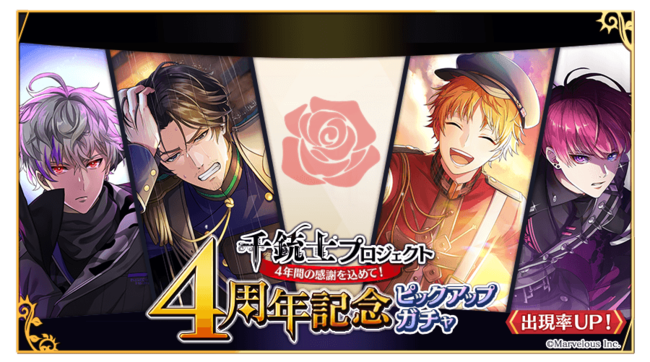 『千銃士:Rhodoknight』「千銃士プロジェクト」4周年!ローズストーンが最大200個もらえるログインボーナスやカサリステがピックアップされたガチャなど記念キャンペーンを開催!