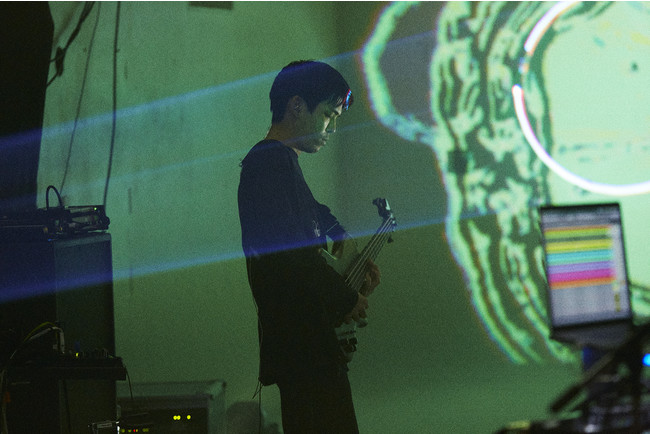 「Fallen Angle」は、『NO MOON』の中でも一際アグレッシヴなナンバー。ケモノの鳴き声をミックスした不穏なシンセをバックに、歌心たっぷりのベースと櫻木の弾くアンビエントなエレキギターが混じり合う。スモークの焚かれた真っ暗な空間をいく筋ものレーザー光線が切り裂いていく、映像作家Ryuichi Onoの演出も圧巻だった。
