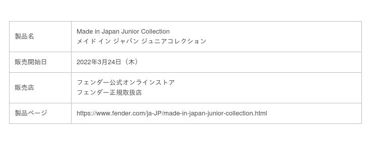 フェンダーミュージック株式会社(所在地:東京都渋谷区、代表取締役社長 アジアパシフィック統括 エドワード・コール)は、これからギター/ベースを始めるエントリープレイヤーや手が小さく小柄なプレイヤーに向けて開発した新製品『Made in Japan Junior Collection(メイド イン ジャパン ジュニアコレクション)』を2022年3月24日(木)よりフェンダー公式オンラインストア及び全国のフェンダー正規取扱店にて販売を開始しました。本製品は、国内限定販売となります。