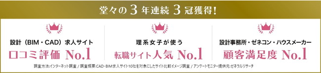 この度、CAD求人.comは、「口コミ評価」「人気転職サイト」「顧客満足度」の3部門で3年連続第1位(※1)に選ばれました。