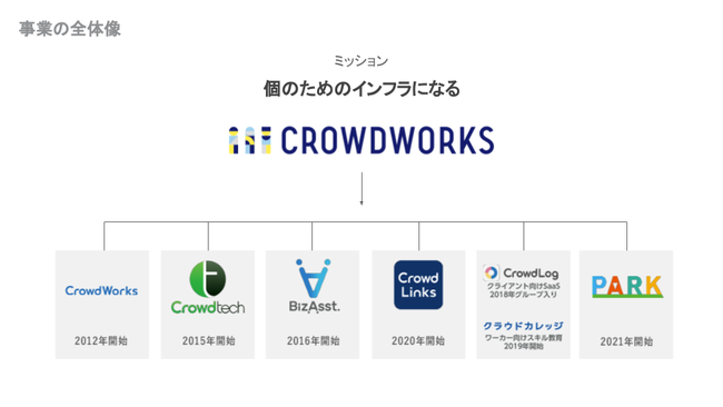 クラウドワークスは「個のためのインフラになる」をミッション、「世界で最もたくさんの人に報酬を届ける会社になる」をビジョンとし、日本最大のクラウドソーシング「クラウドワークス」をはじめとした企業と個人をつなぐオンライン人材マッチングプラットフォームを開発・運営しています。2021年12月末時点で、当社提供サービスのユーザーは480万人、クライアント数は78万社に達し、内閣府・経産省・外務省など政府12府省を筆頭に、80以上の自治体、行政関連団体にも利用されています。2014年に東証マザーズ上場(証券コード3900)、2015年には経済産業省 第1回「日本ベンチャー大賞」ワークスタイル革新賞および、グッドデザイン・未来づくりデザイン賞を受賞。