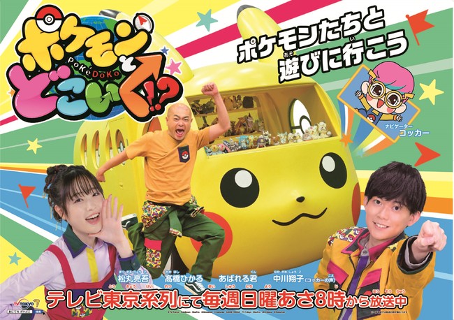ピカチュウの形をした“どこいこっカー”に乗って、ポケリーダー・松丸亮吾、ポケルーキー・高橋ひかる、ドライバーのあばれる君とナビの“コッカー”(声:中川翔子)と一緒に世界中を駆け巡る!