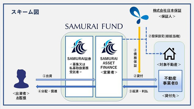 このファンドは、営業者であるSAMURAI ASSET FINANCE株式会社(以下、「営業者」といいます。)が不動産事業者B(以下、「本貸付先」といいます。)に対して貸し付け(以下、「本件貸付」といいます。)する貸付型クラウドファンディングとなります。