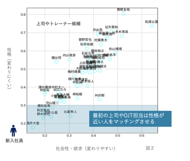 また図2では、新入社員と性格の近い社員を抽出することで、気持ちを理解してあげられる適切な相談相手を選定することができます。