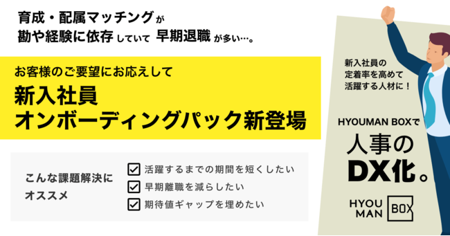新型コロナウィルス感染拡大から 2 年が経過し、オンラインでの新入社員教育も定着しつつありますが、一定 のオンライン移行が進んだ今、改めてオフラインとオンラインのそれぞれの良さを体感し、新たな課題に直面 している企業も多いのでは無いでしょうか。 HYOUMAN BOX は適性検査の結果を元に、自社に適した人材の採用、育成、最適配置をすることで組織作り を強化する SaaS サービスですが、この春、特にニーズの高い“新入社員オンボーディング”に特化したコンサ ルティングパックの提供を開始致しました。