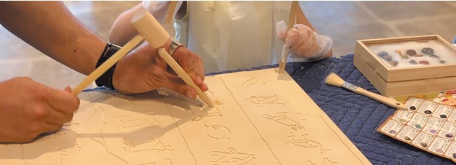 木製のハンマーとノミ・ハケを使い、砂の中に埋まっている本物の化石・鉱石を発掘するワークショップ。