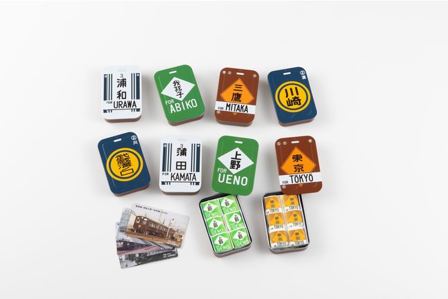 ◎マシュマロと缶容器に、昭和に活躍した旧型電車の行先表示をプリント