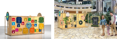 SDGsおよび「TUTTI」の紹介パネルを設置。見るだけでなく、触って体験することで、小さなお子様も一緒に学べる仕掛けのある展示を設置いたします。また、展示物には間伐材を使用し、再利用できる工夫をしています。