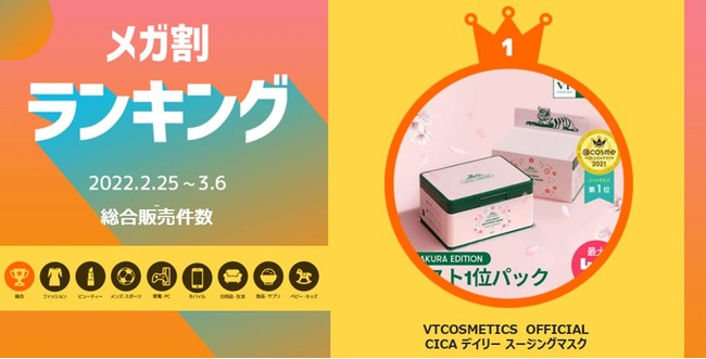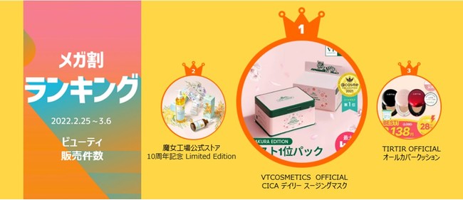 今回1位に輝いた商品は、VT COSMETICSの「CICAデイリー スージングマスク」でした。メガ割のランキングでは常に上位にランクインするこのアイテムが、今回も1位となりました。マスクや乾燥で肌荒れしてしまったときでも使える万能アイテムとして、人気を博しています。2位には、スキンケアブランド・魔女工場の春らしいデザインのコラボレーションパッケージ版「10周年記念 Limited Edition」がランクインし、3位には、マスクにつきにくいクッションファンデーションとして話題のTIRTIR「マスクフィットオールカバークッション」が並びました。