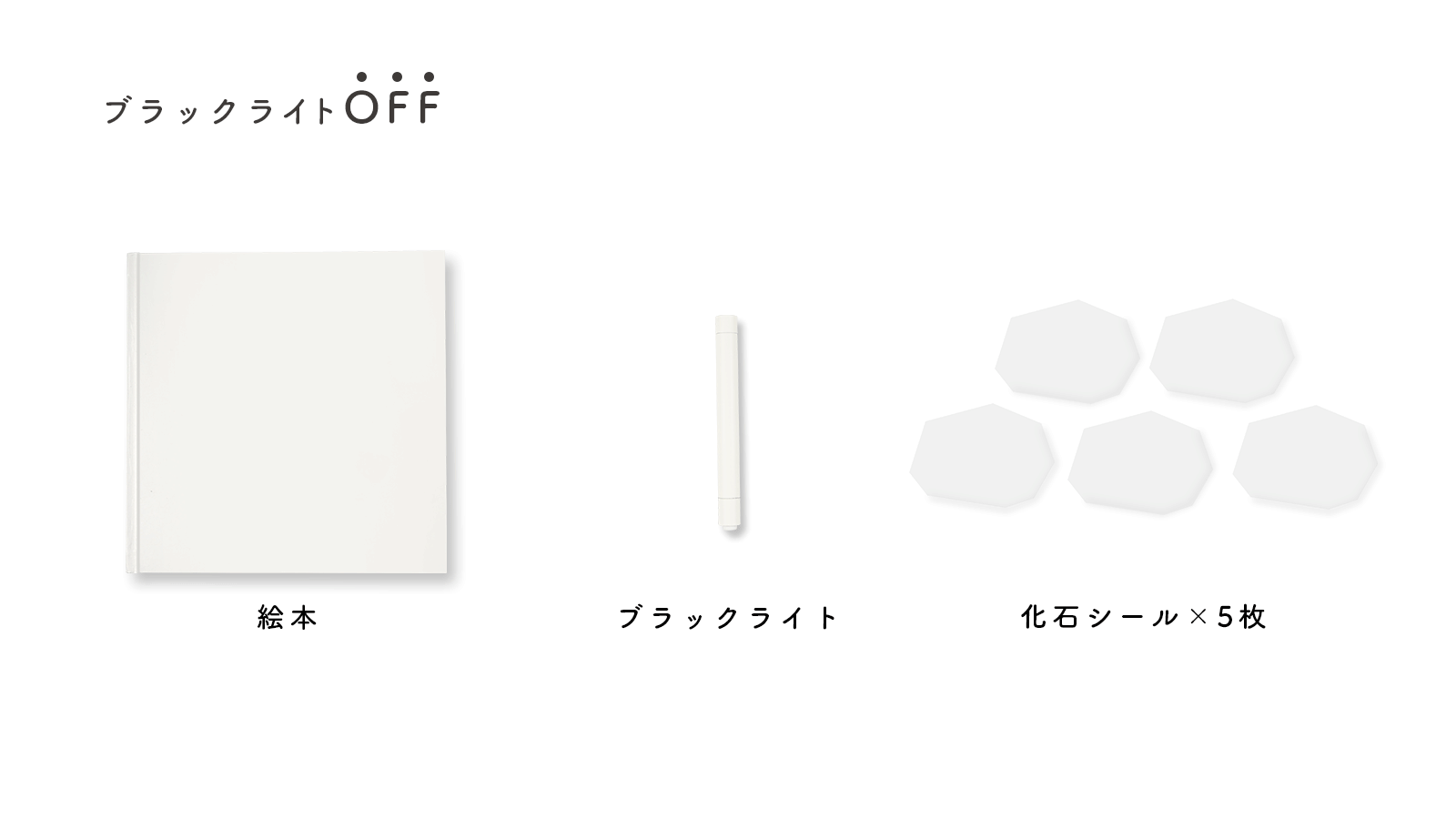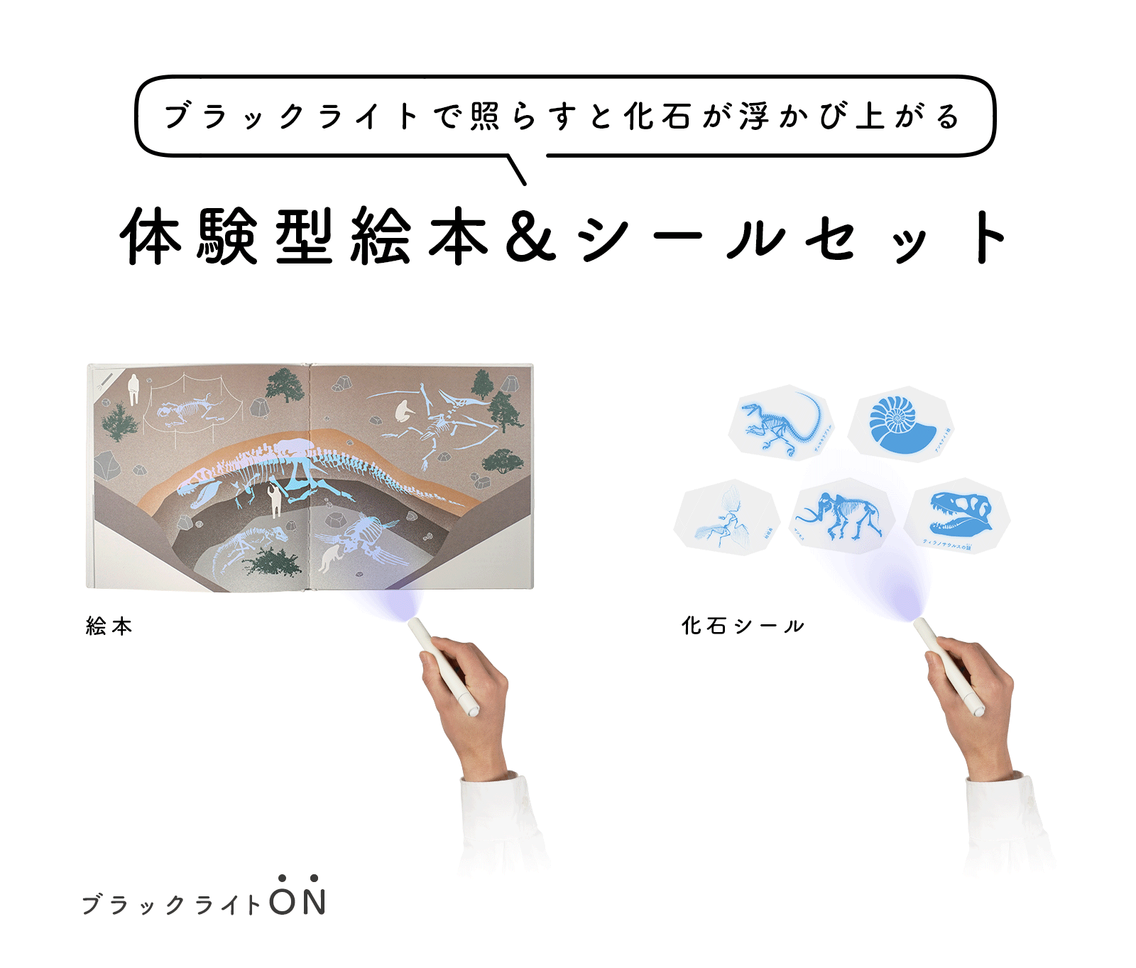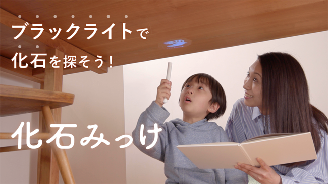 本製品は特殊な印刷技術を使用した、絵本・シール・ブラックライトのセットで、絵本内の隠れた化石をライトで照らして見つけたり、シールを家の中に貼り付けライトを当てながら探すことで、古生物学者のような化石探しを体験できます。