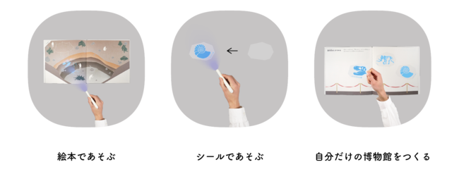 絵本やシールにブラックライトを当てて化石を見つけて遊ぶことはもちろんのこと、見つけたシールを絵本内に貼り付け、自分だけの博物館をつくるなど、組み合わせて使うことでより一層楽しむことができます。
