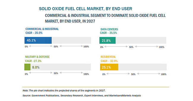 固体酸化物形燃料電池(SOFC)の市場規模は、2022年の15億米ドルからCAGR33.9%で成長し、2027年には65億米ドルに達すると予測されています。固体酸化物形燃料電池は、運転効率が高く、運転中に発生する熱を利用することでさらに効率を高めることができます。固体酸化物形燃料電池市場の牽引要因は、政府からの補助金や燃料電池プログラムに関する研究開発の増加、燃料の柔軟性、エネルギー効率の高い発電に対する需要の増加、厳しい排出規制などが挙げられます。