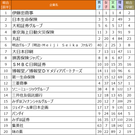 伊藤忠商事が、21卒前半・22卒前半に続き、3年連続の総合TOPとなりました。区分別では、文系・女子で3年連続のTOPとなりました。さらに、男子に至っては4年連続のTOPとなっており、男子を中心にその人気を盤石なものにしつつあります。