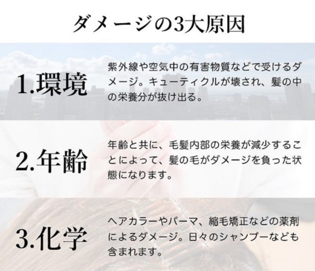 ダメージを受け破壊された毛髪内部のタンパク質は、外部から補修をしてあげないとうねりやごわつきの原因になります。