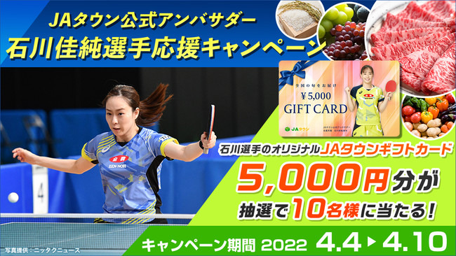 この応援キャンペーンでは、ツイッター「JAタウン【公式】」をフォローし、該当のツイートをリツイートすると、石川選手のオリジナル「JAタウンギフトカード(5,000円分)」を抽選で10名様にプレゼントします。