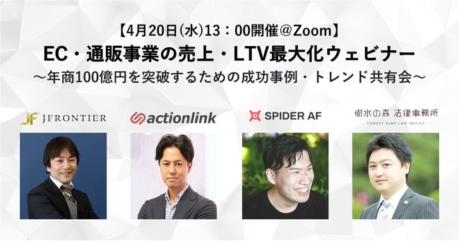 株式会社Spider Labs(東京都港区、代表取締役社長:大月 聡子、スパイダーラボズ 以下Spider Labs)は、2022年4月20日(水)にEC・通販事業の売上・LTV最大化ウェビナー~年商100億円を突破するための成功事例・トレンド共有会~と題して、4社合同の共催ウェビナーに登壇決定いたしました。(セミナー申し込みURL:https://bit.ly/36LVwJF)