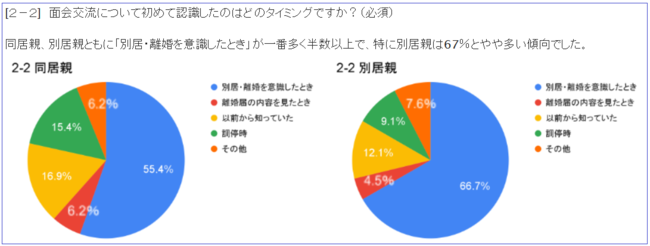 びじっとでは、びじっとの支援を利用して面会交流をおこなっている利用者を対象に、びじっと利用者アンケート調査を実施(2022年1月28日~2月13日)し、利用者282名(同居親・別居親の合計)中、131名(同居親:65名/別居親:66名)に回答頂きました。本アンケートにより、父母が「面会交流」を認識したのは「別居・離婚を意識したとき」が最も多いことが分かりました。びじっとは、父母や周囲の方々が「面会交流」を事前に知ることの大切さを再確認し、面会交流相談窓口の拡充やセミナーを通して、新たな生活を始める多くの方々に「面会交流」を知ってもらう取り組みを始めます。