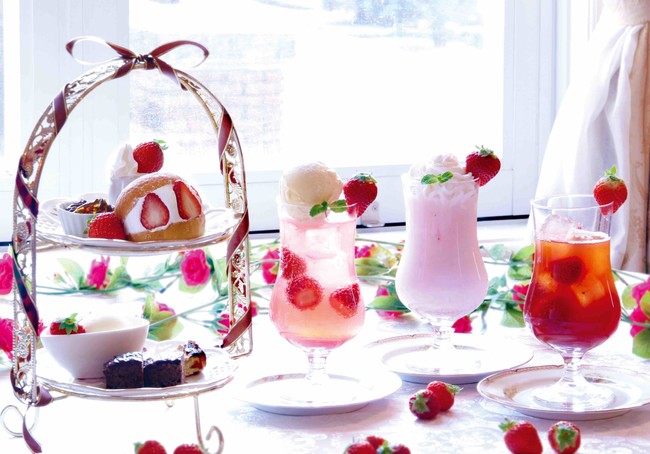 いちごづくしのドリンクやスイーツで春らしい優雅なティータイムを過ごせます。自分へのご褒美にいかが?