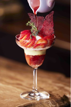 食事やお酒の後の〆パフェにおススメ。イチゴの甘酸っぱジューシーな味わいにリキュールを加え、芳醇な味わいに仕上げました。