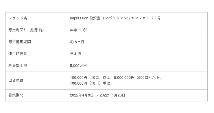 「未来をわかちあう投資」を提供する「Funvest(ファンベスト)」(以下、Funvest)は、「Impression 投資型コンパクトマンションファンド1号」(以下、本ファンド)の募集を4/8より開始しますので、お知らせいたします。