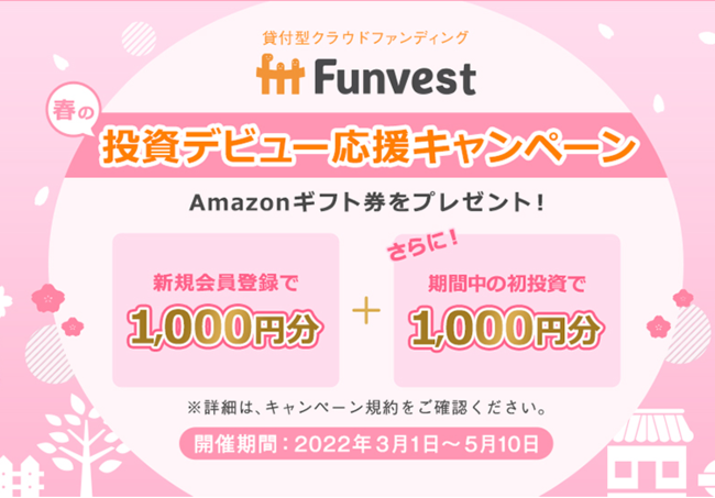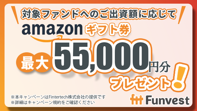 また、本ファンドに出資していただいた投資家の皆様を対象として、出資額に応じて最大55,000円分のAmazonギフト券をプレゼントするキャンペーンも併せて実施いたします。