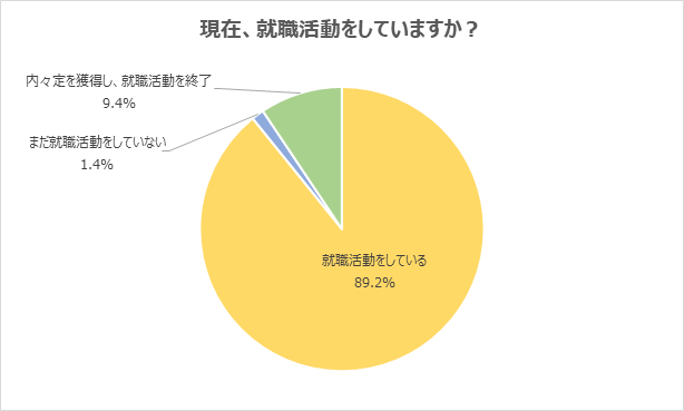 現在の就職活動状況について、「就職活動をしている」の回答が89.2%に上りました。内々定を獲得している学生も、大半は就職活動を継続していることが分かります。9.4%の学生は、「内々定を獲得し、就職活動を終了」と回答しました。「就職活動を終了」の回答は前月比5.7ポイント増加しています。