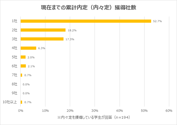 現在までの累計での内々定獲得社数は、「1社」が52.7%で最多。次いで、「2社」18.2%、「3社」17.3%と続きました。内々定を獲得している学生のうち47.3%が「2社以上」から内々定を得ていることが明らかになりました。平均内々定獲得社数は「2.00社」で、前年同時期よりも0.41社増加しています。