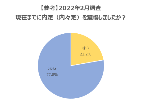 2022年3月末時点の内々定率は、35.0%。前月比では12.8ポイント増加しました。前年同時期比でも、1.2ポイント増加しています。