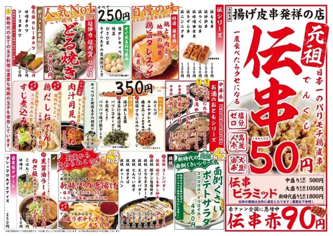 1)登録商標!新時代の名物!日本一のパリモチ鶏皮串「伝串」