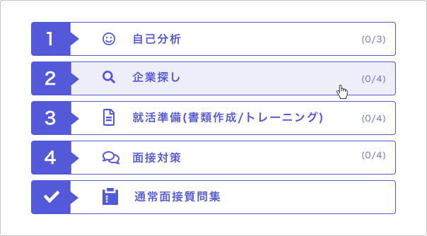 就職活動における必要なSTEPをわかりやすく提示し、カリキュラムのように進めていくことができます。