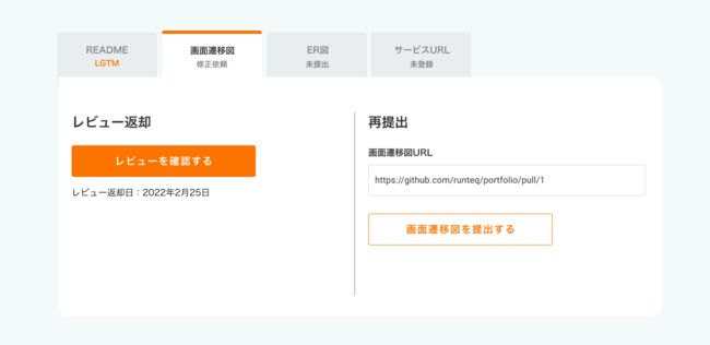 ポートフォリオ(Webサービス)を1から開発するにあたって、必要なサービス企画(README)、画面設計(画面遷移図)、データベース設計(ER図)の3点をアプリ内で講師にレビューしてもらうことが可能です。(※現在、添削に回数制限はございません。)